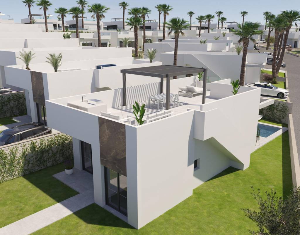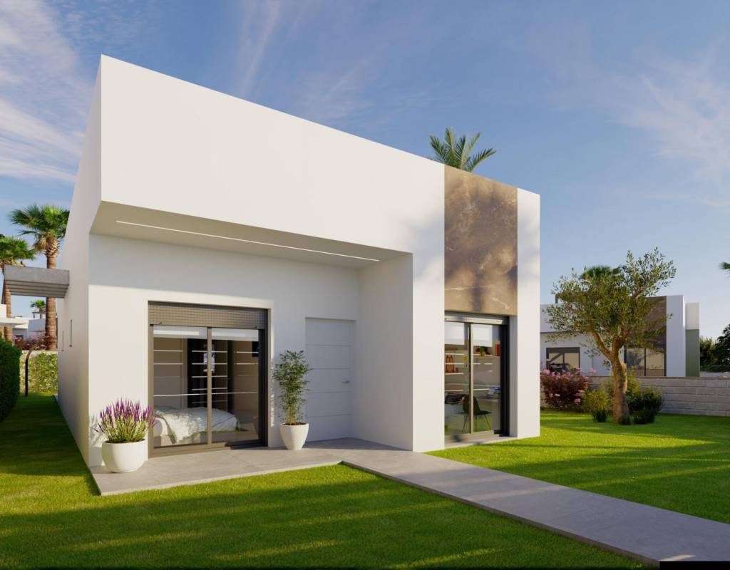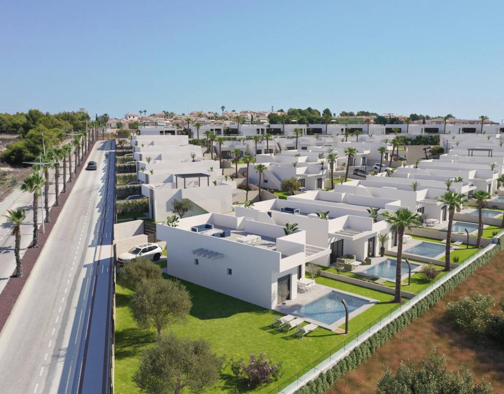 NYBYGG VILLAER I ALGORFA GOLF RESORT~~Nybygg bolig av uavhengige villaer i La Finca golfbane, Algorfa.~~Villaer bygget over 1 etasje og består av 3 soverom, 2 bad, åpen kjøkkenløsning, stue med åpen utsikt til terrassen, solarium, privat hage med basseng og parkering.~~~Boligkompleks som ligger i La Finca Golf resort, i Algorfa kommune, i Vega Baja-området på Costa Blanca sør.~~Bare 15 minutters kjøretur fra sandstrendene i Guardamar del Segura, og bare 35 minutter fra Alicante flyplass.~~De større byene Almoradi, Benijófar og Ciudad Quesada ligger en kort kjøretur unna.~~Torrevieja og Orihuela Costa, med sine store kjøpesentre, ligger 15 minutter unna.