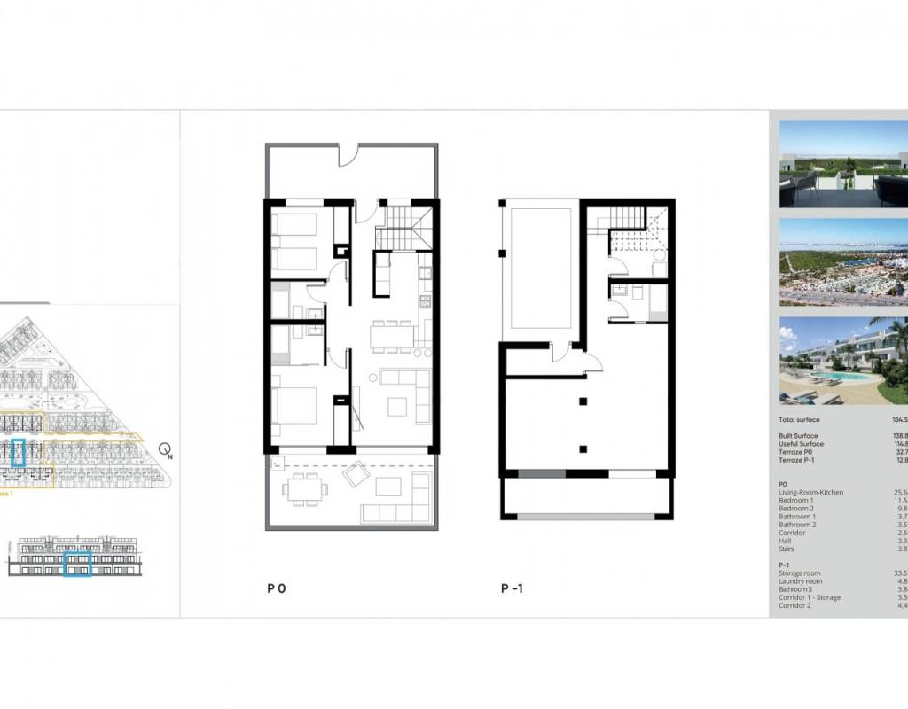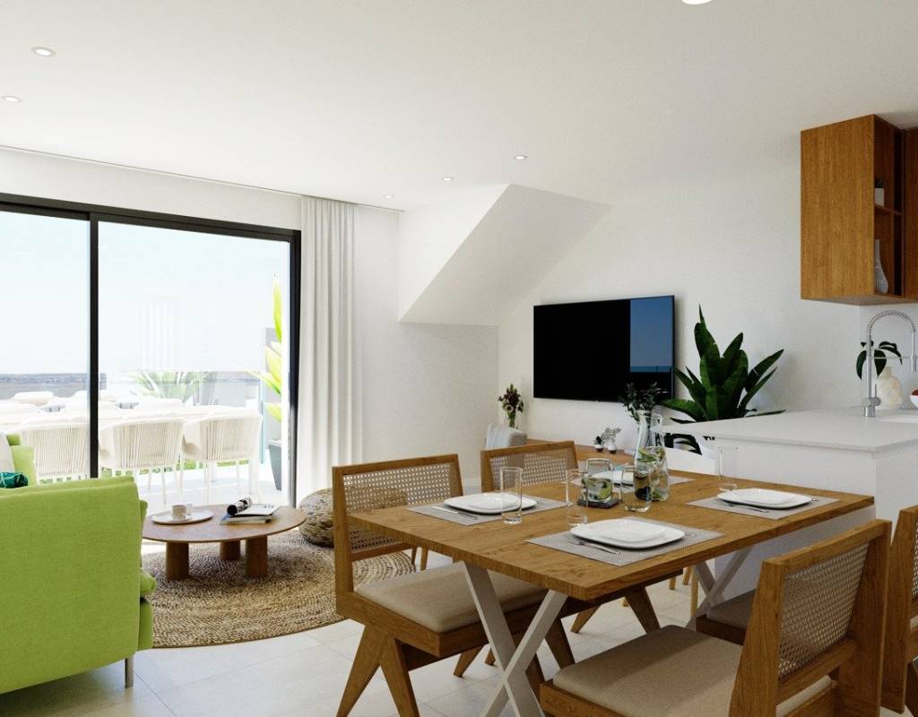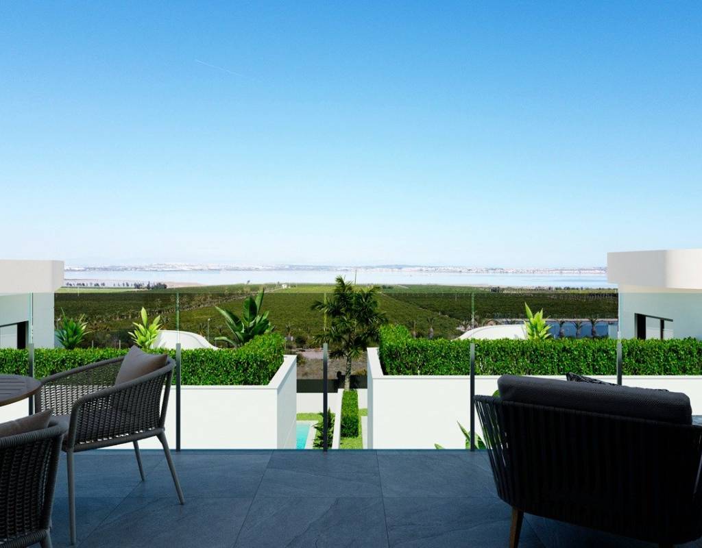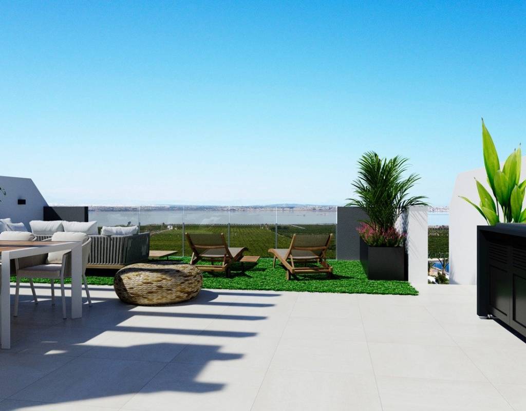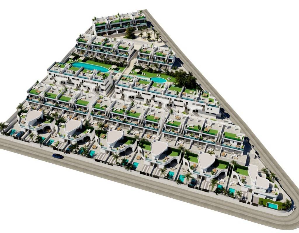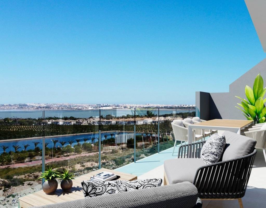 RESIDENCIAL DE OBRA NUEVA EN LOS BALCONES, TORREVIEJA~~Complejo residencial de nueva construcción de pareados y bungalows situado en Los Balcones con vistas al lago rosa.~~Los bungalows de planta alta disponen de 2 dormitorios, 2 baños, cocina americana con amplio salón, armarios empotrados, terraza, solarium privado y plaza de aparcamiento subterráneo.~~Nuevo y exclusivo residencial con grandes zonas comunes; jardines, jardín-gimnasio, parque infantil, 2 grandes piscinas comunitarias - una de ellas para adultos, y la otra para niños.~~~Los Balcones es un pequeño pueblo situado cerca del sur de Torrevieja.~~Torrevieja es una ciudad española en la provincia de Alicante, en la Costa Blanca. ~~Es conocida por su clima y su costa típicamente mediterráneos. Cuenta con paseos marítimos con complejos turísticos a lo largo de sus playas de arena. ~~El pequeño Museo del Mar y la Sal alberga exposiciones sobre la historia pesquera y salinera de la ciudad. ~~En el interior, el Parque Natural de las Lagunas de La Mata-Torrevieja cuenta con senderos y dos lagunas saladas, una rosa y otra verde.~~El aeropuerto de Alicante se encuentra a 40 minutos y el de Murcia a una hora.~~