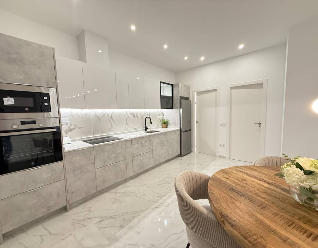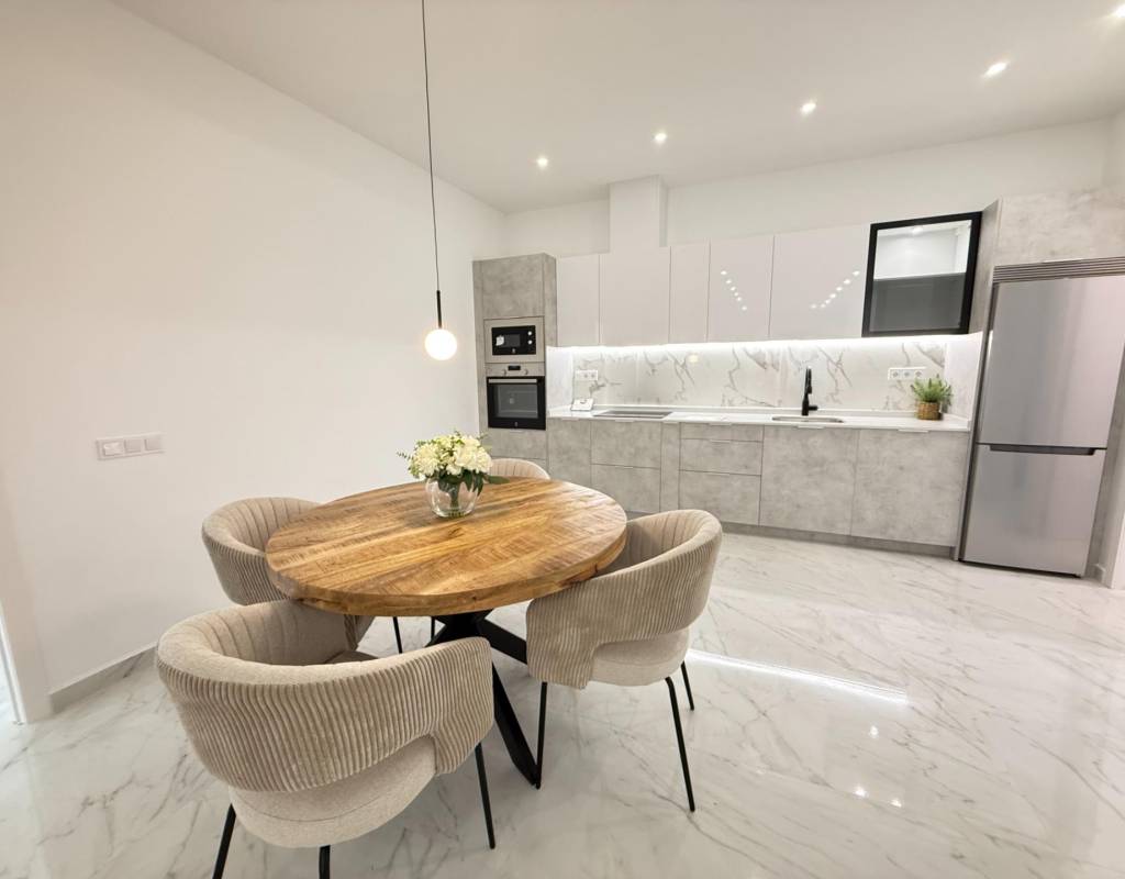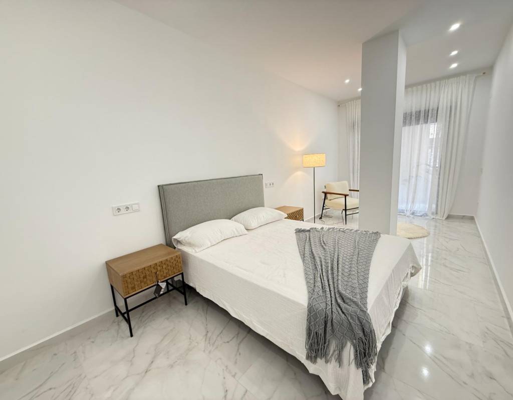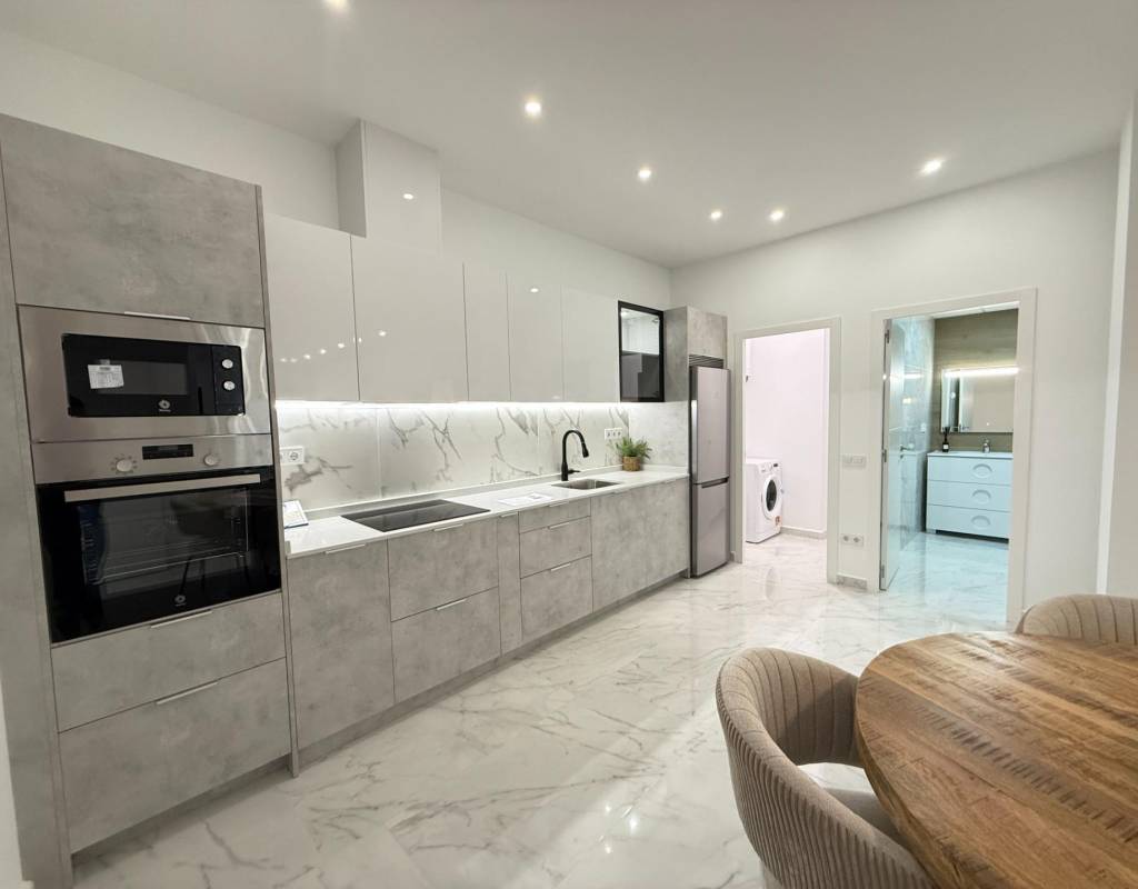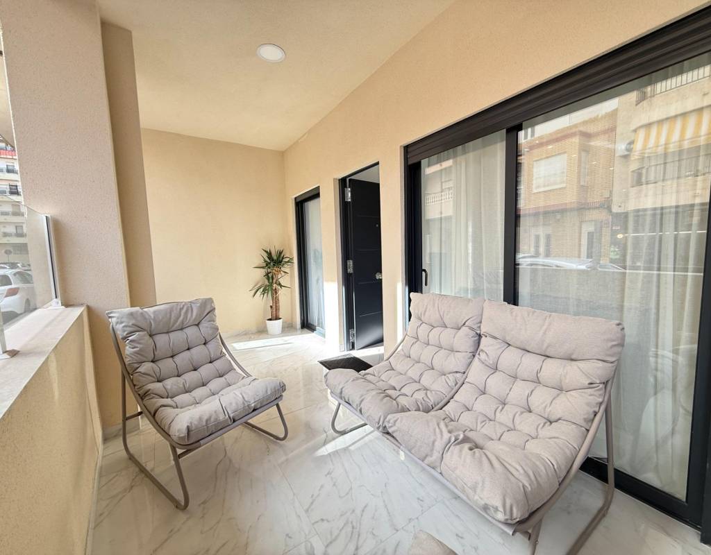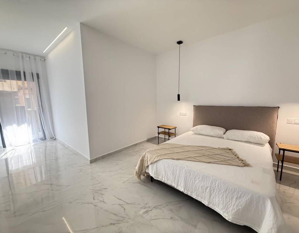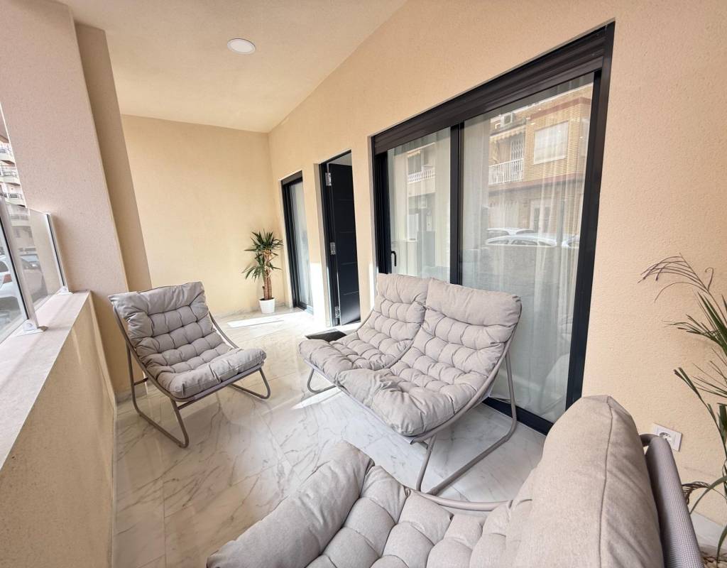 En venta esta increíble oportunidad de vivienda de obra nueva en el mismo centro de Torrevieja, a tan solo un paso del paseo de Juan Aparicio y en segunda linea de playa. En esta vivienda se disfruta de una gran luminosidad, con luz natural gracias a su orientación sur y ofrece un estilo moderno y elegante.~~Esta propiedad destaca por su distribución y por el equilibrio perfecto entre diseño, funcionalidad y calidad. Dispone de 2 dormitorios, el dormitorio principal esta equipado con baño privado y un espacioso vestidor, ideal para quienes valoran la comodidad y la organización. El segundo dormitorio cuenta con acceso directo a la terraza, lo que aporta una agradable sensación de amplitud y luminosidad. Además, la vivienda incluye un segundo baño completo con plato de ducha y sistema de suelo radiante, diseñado con materiales de primera calidad.~~El salón-comedor y la cocina forman un espacio abierto, moderno y acogedor. La cocina está completamente equipada con electrodomésticos de última generación, integrados de forma armoniosa en un diseño contemporáneo y funcional. A ello se suma una práctica despensa que ofrece un excelente espacio de almacenamiento, así como una espectacular terraza de 12,27 m², perfecto para disfrutar del clima templado de Torrevieja durante todo el año.~~Esta propiedad se entrega completamente amueblada, con mobiliario de alta gama importado desde Italia y Portugal. Cada estancia ha sido decorada con un estilo moderno y sofisticado, creando un ambiente equilibrado y acogedor. Además, la vivienda incluye persianas eléctricas, amplios ventanales de alta calidad que aportan aislamiento térmico y acústico, y acabados de lujo en todas las zonas, garantizando la máxima eficiencia y bienestar.~~La vivienda se encuentra en la planta baja de un edificio ya existente, lo que ofrece fácil accesibilidad y una mayor comodidad para el día a día. Su ubicación es inmejorable: en una de las áreas más demandadas de Torrevieja.~~Esta propiedad representa una oportunidad excepcional tanto como residencia habitual, como para aquellos que buscan una inversión segura y rentable en una de las zonas más codiciadas de la Costa Blanca. Sin duda, una oportunidad única para disfrutar de la vida en Torrevieja desde una perspectiva de lujo, confort y elegancia contemporánea.