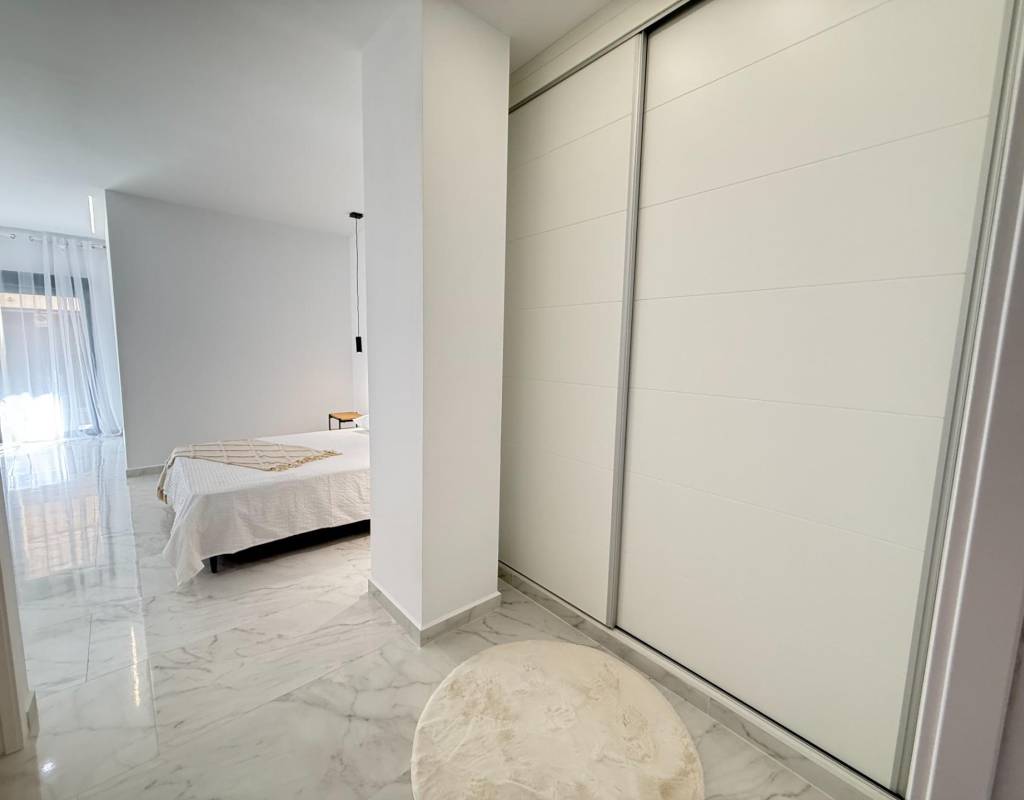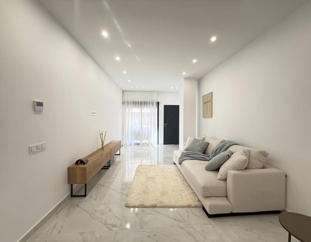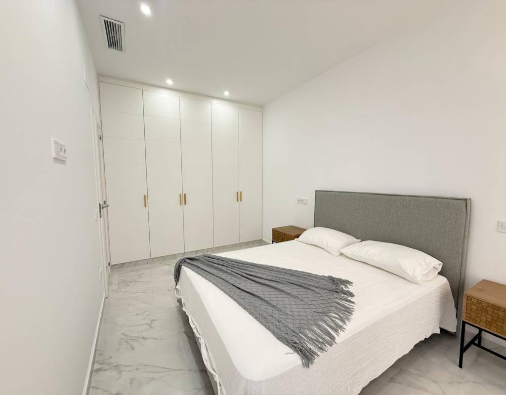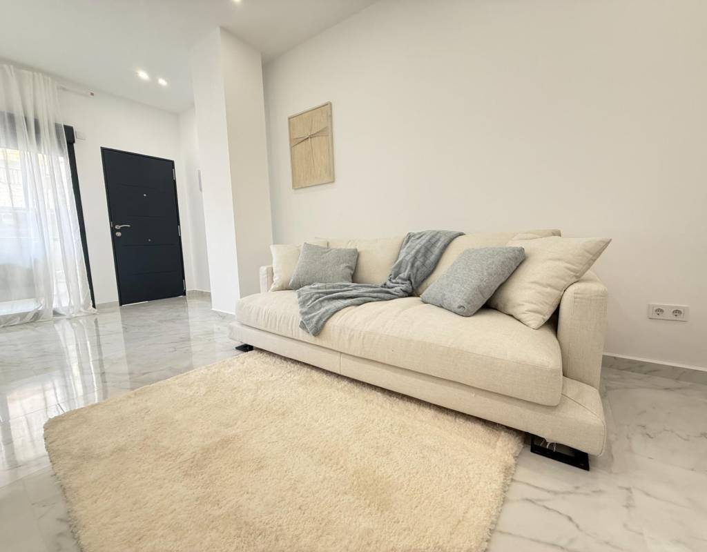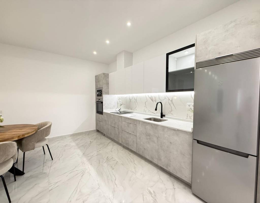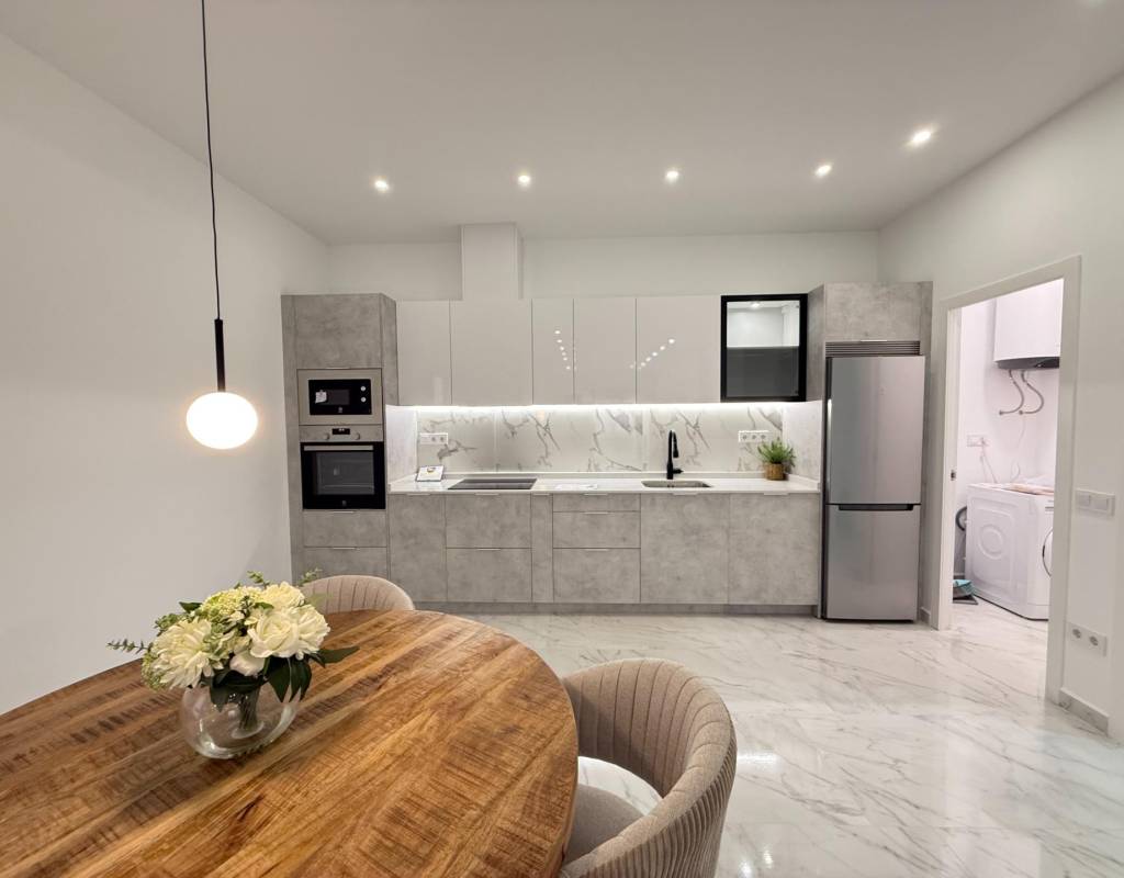 En venta esta increíble oportunidad de vivienda de obra nueva en el mismo centro de Torrevieja, a tan solo un paso del paseo de Juan Aparicio y en segunda linea de playa. En esta vivienda se disfruta de una gran luminosidad, con luz natural gracias a su orientación sur y ofrece un estilo moderno y elegante.~~Esta propiedad destaca por su distribución y por el equilibrio perfecto entre diseño, funcionalidad y calidad. Dispone de 2 dormitorios, el dormitorio principal esta equipado con baño privado y un espacioso vestidor, ideal para quienes valoran la comodidad y la organización. El segundo dormitorio cuenta con acceso directo a la terraza, lo que aporta una agradable sensación de amplitud y luminosidad. Además, la vivienda incluye un segundo baño completo con plato de ducha y sistema de suelo radiante, diseñado con materiales de primera calidad.~~El salón-comedor y la cocina forman un espacio abierto, moderno y acogedor. La cocina está completamente equipada con electrodomésticos de última generación, integrados de forma armoniosa en un diseño contemporáneo y funcional. A ello se suma una práctica despensa que ofrece un excelente espacio de almacenamiento, así como una espectacular terraza de 12,27 m², perfecto para disfrutar del clima templado de Torrevieja durante todo el año.~~Esta propiedad se entrega completamente amueblada, con mobiliario de alta gama importado desde Italia y Portugal. Cada estancia ha sido decorada con un estilo moderno y sofisticado, creando un ambiente equilibrado y acogedor. Además, la vivienda incluye persianas eléctricas, amplios ventanales de alta calidad que aportan aislamiento térmico y acústico, y acabados de lujo en todas las zonas, garantizando la máxima eficiencia y bienestar.~~La vivienda se encuentra en la planta baja de un edificio ya existente, lo que ofrece fácil accesibilidad y una mayor comodidad para el día a día. Su ubicación es inmejorable: en una de las áreas más demandadas de Torrevieja.~~Esta propiedad representa una oportunidad excepcional tanto como residencia habitual, como para aquellos que buscan una inversión segura y rentable en una de las zonas más codiciadas de la Costa Blanca. Sin duda, una oportunidad única para disfrutar de la vida en Torrevieja desde una perspectiva de lujo, confort y elegancia contemporánea.