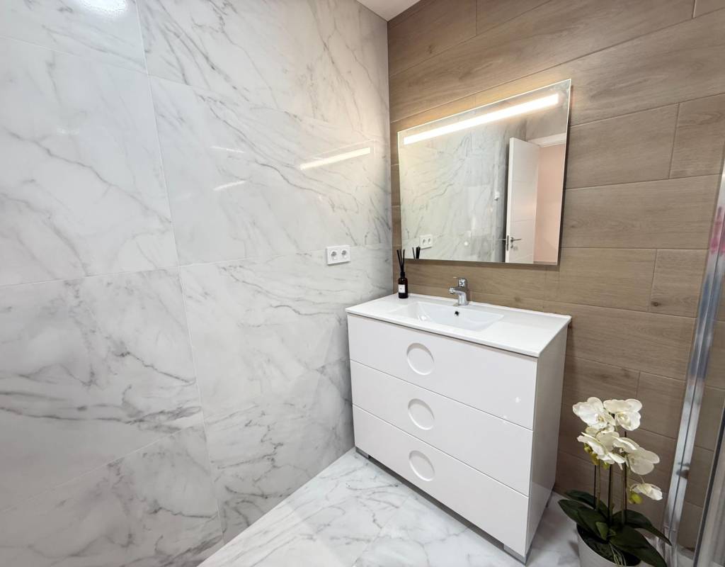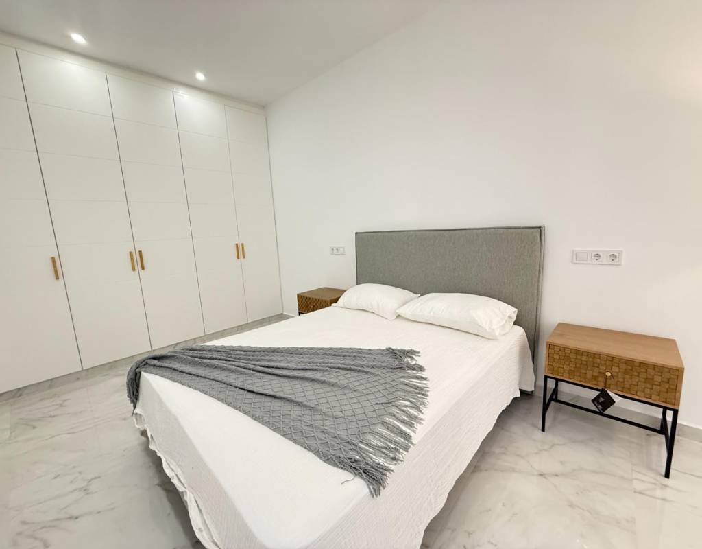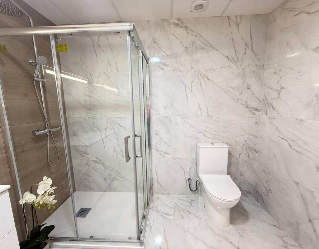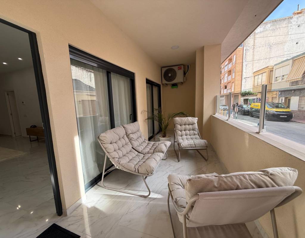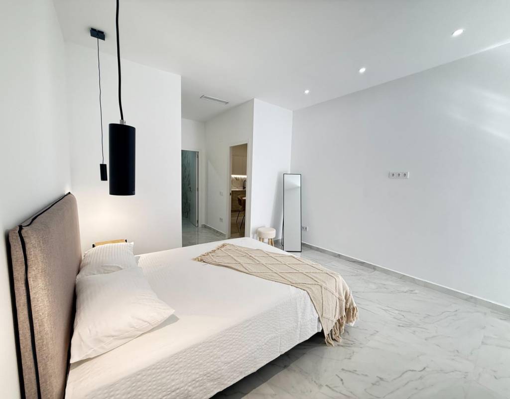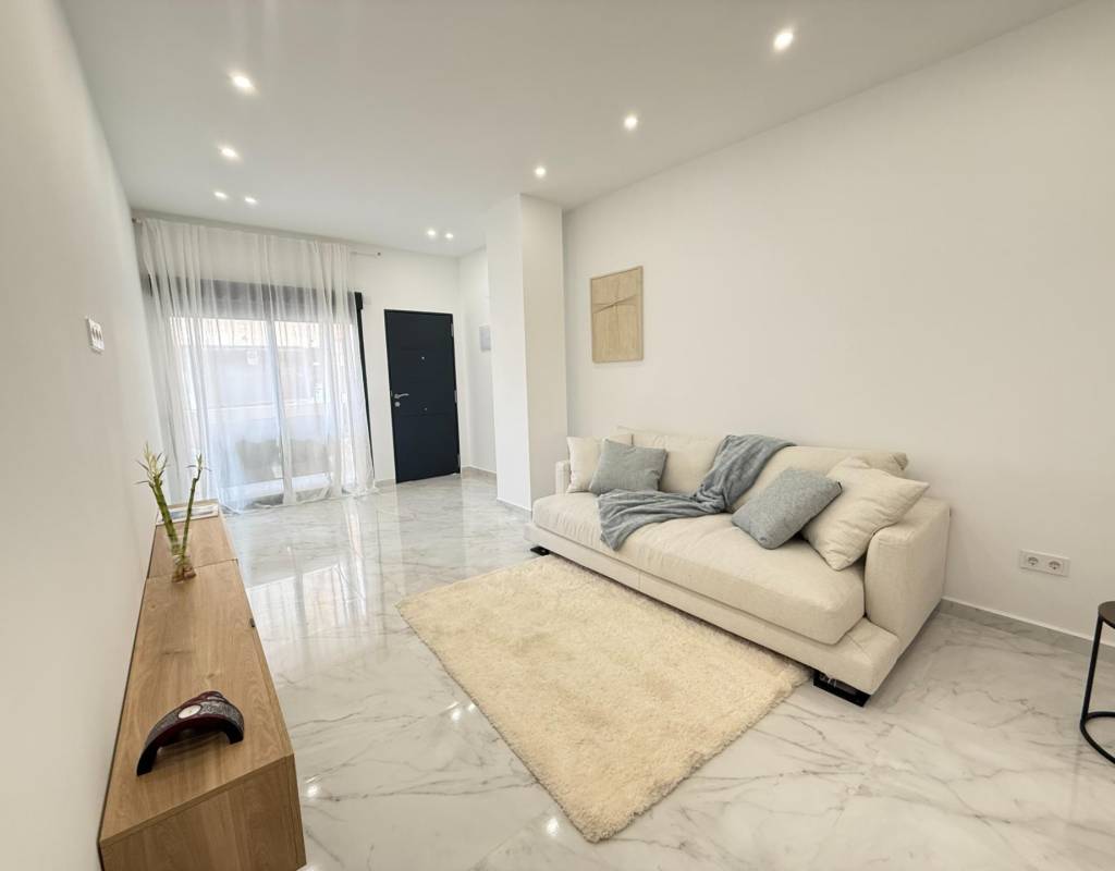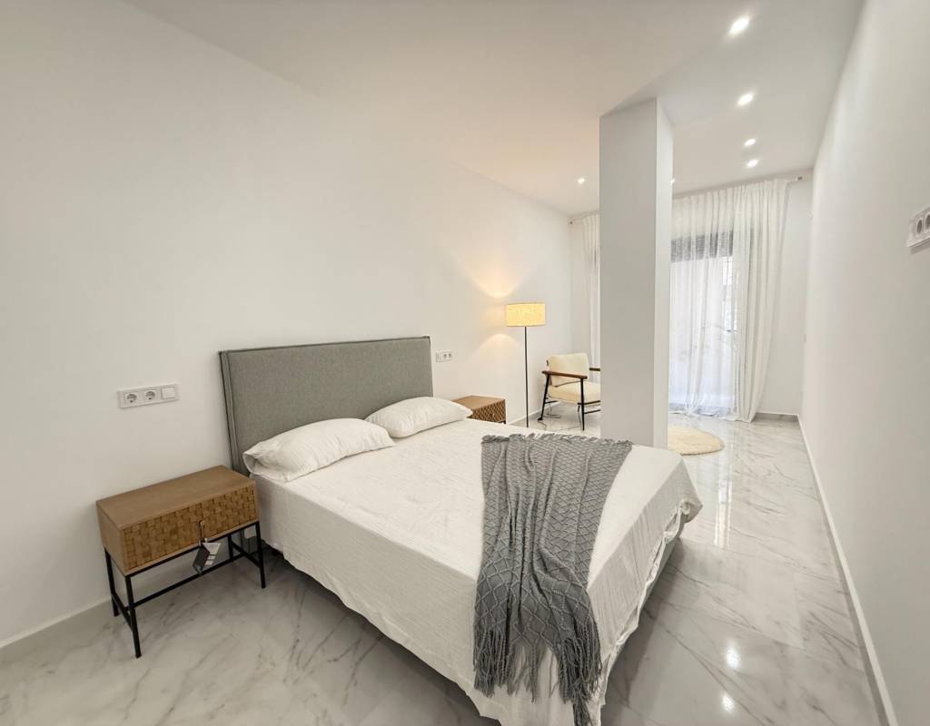 En venta esta increíble oportunidad de vivienda de obra nueva en el mismo centro de Torrevieja, a tan solo un paso del paseo de Juan Aparicio y en segunda linea de playa. En esta vivienda se disfruta de una gran luminosidad, con luz natural gracias a su orientación sur y ofrece un estilo moderno y elegante.~~Esta propiedad destaca por su distribución y por el equilibrio perfecto entre diseño, funcionalidad y calidad. Dispone de 2 dormitorios, el dormitorio principal esta equipado con baño privado y un espacioso vestidor, ideal para quienes valoran la comodidad y la organización. El segundo dormitorio cuenta con acceso directo a la terraza, lo que aporta una agradable sensación de amplitud y luminosidad. Además, la vivienda incluye un segundo baño completo con plato de ducha y sistema de suelo radiante, diseñado con materiales de primera calidad.~~El salón-comedor y la cocina forman un espacio abierto, moderno y acogedor. La cocina está completamente equipada con electrodomésticos de última generación, integrados de forma armoniosa en un diseño contemporáneo y funcional. A ello se suma una práctica despensa que ofrece un excelente espacio de almacenamiento, así como una espectacular terraza de 12,27 m², perfecto para disfrutar del clima templado de Torrevieja durante todo el año.~~Esta propiedad se entrega completamente amueblada, con mobiliario de alta gama importado desde Italia y Portugal. Cada estancia ha sido decorada con un estilo moderno y sofisticado, creando un ambiente equilibrado y acogedor. Además, la vivienda incluye persianas eléctricas, amplios ventanales de alta calidad que aportan aislamiento térmico y acústico, y acabados de lujo en todas las zonas, garantizando la máxima eficiencia y bienestar.~~La vivienda se encuentra en la planta baja de un edificio ya existente, lo que ofrece fácil accesibilidad y una mayor comodidad para el día a día. Su ubicación es inmejorable: en una de las áreas más demandadas de Torrevieja.~~Esta propiedad representa una oportunidad excepcional tanto como residencia habitual, como para aquellos que buscan una inversión segura y rentable en una de las zonas más codiciadas de la Costa Blanca. Sin duda, una oportunidad única para disfrutar de la vida en Torrevieja desde una perspectiva de lujo, confort y elegancia contemporánea.