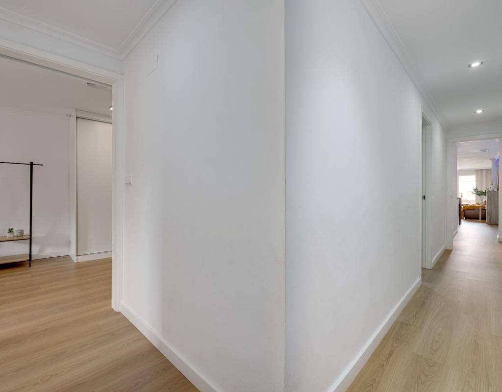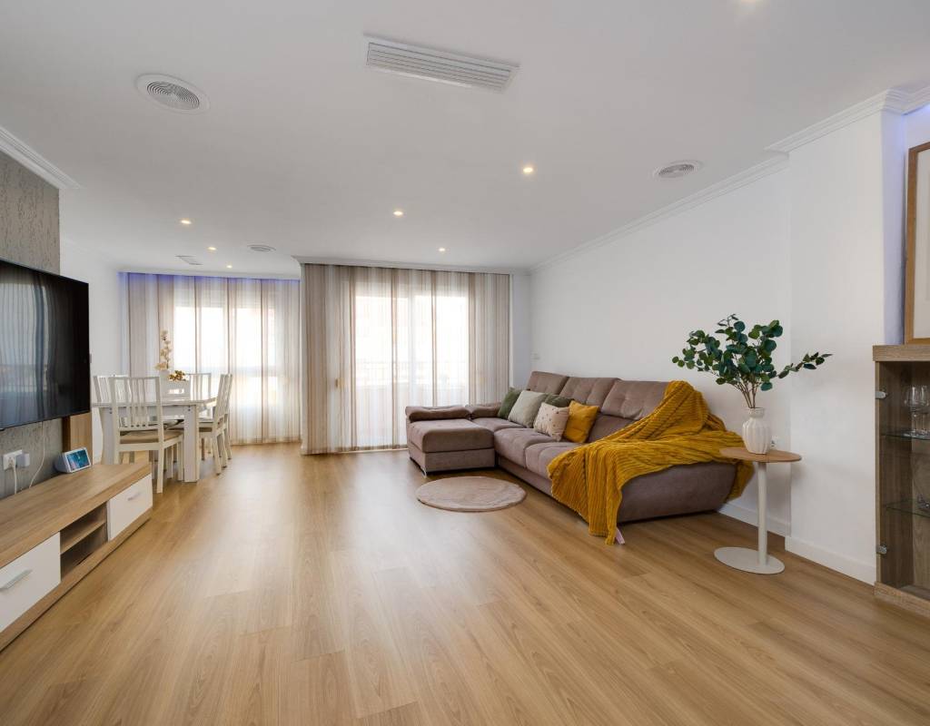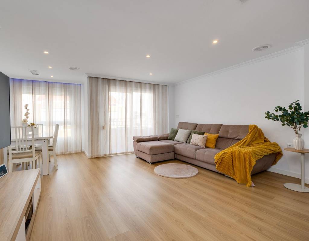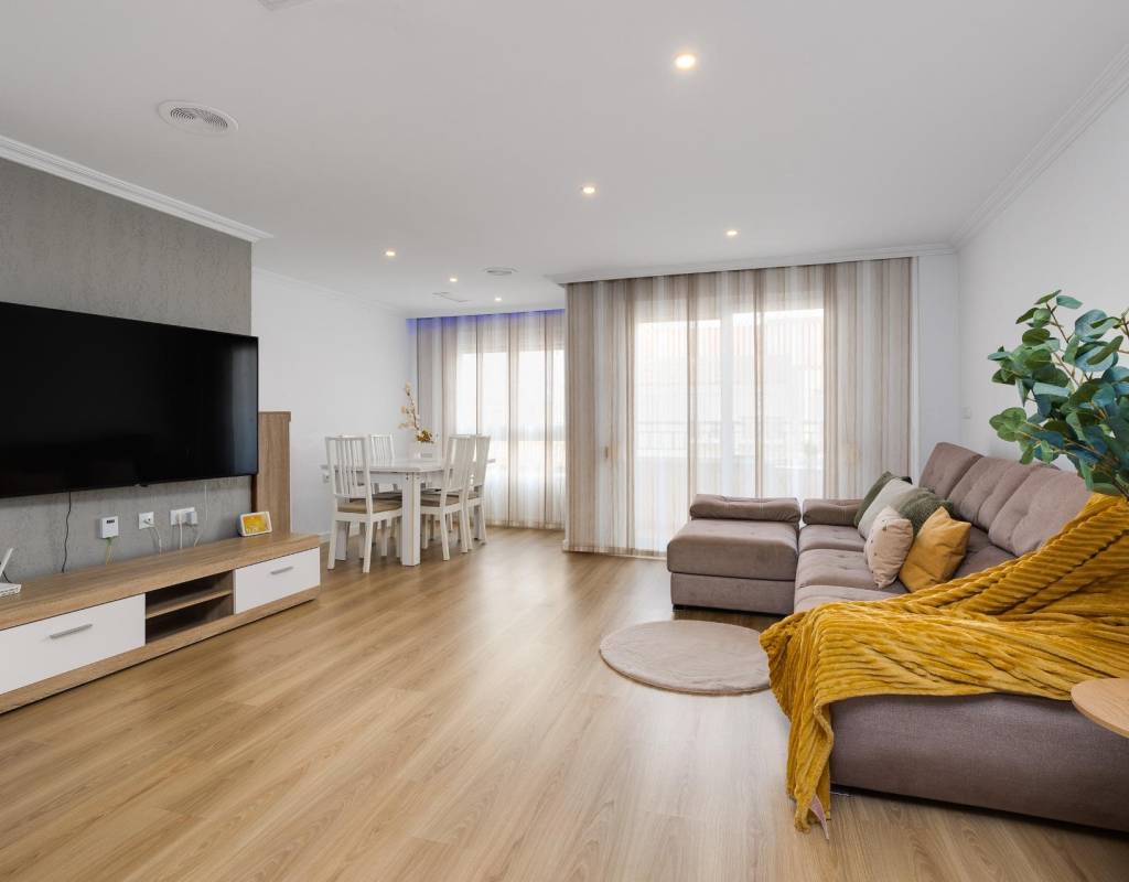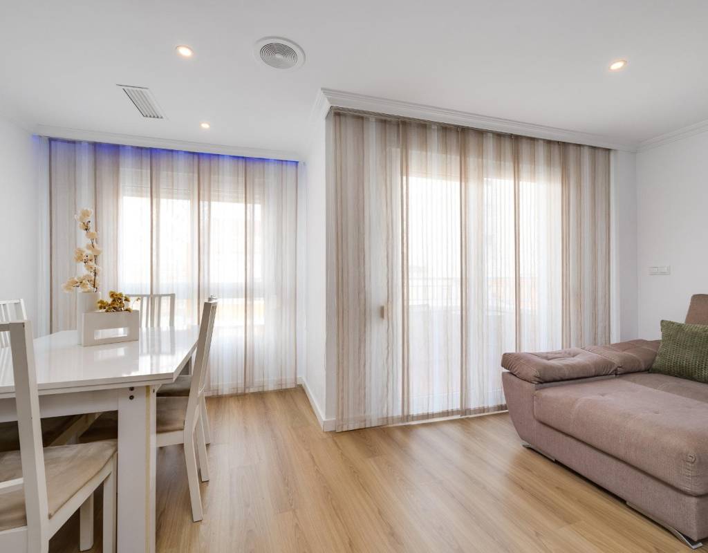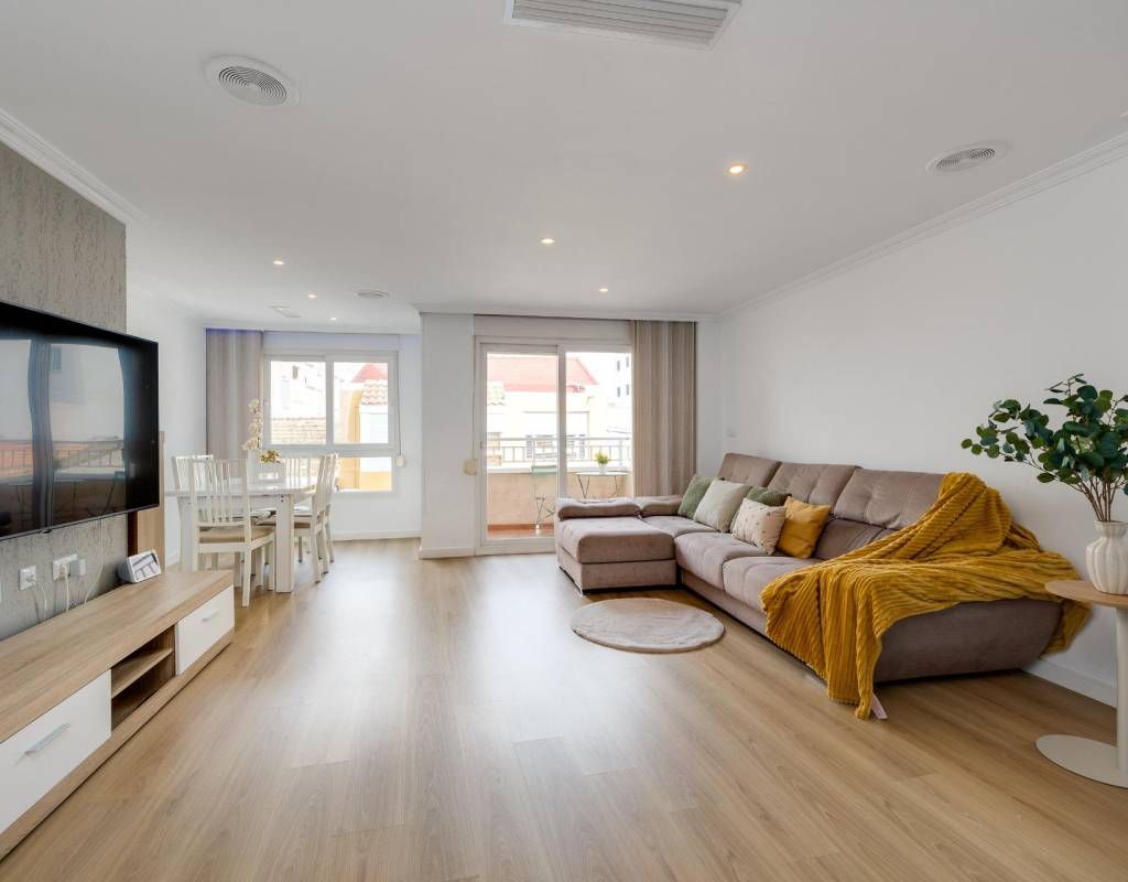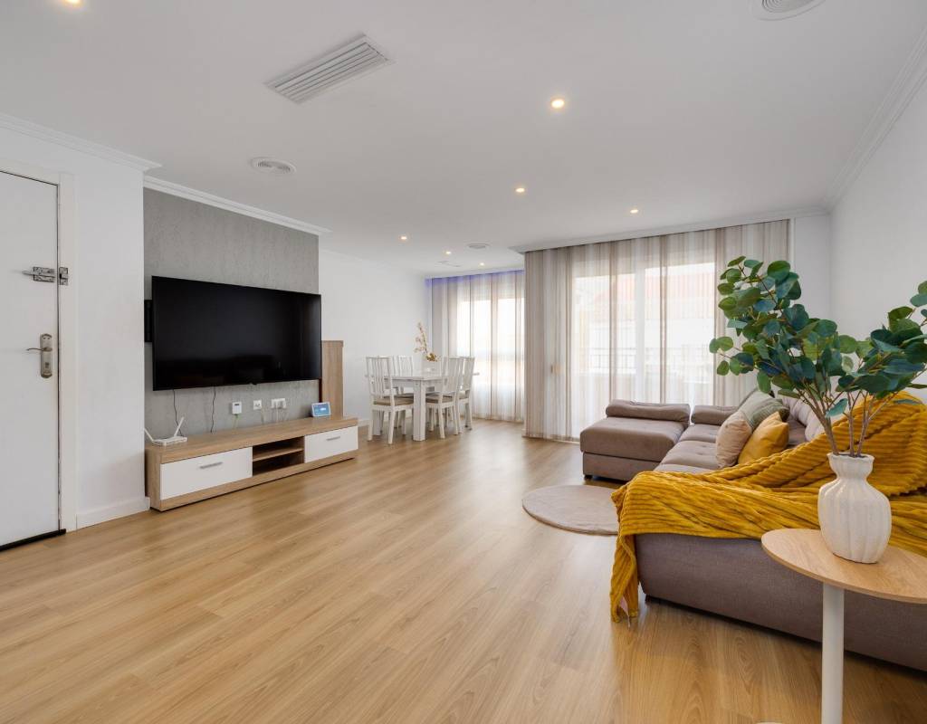 Descubre este magnífico y amplio apartamento, ubicado en pleno centro de Torrevieja, con todos los servicios a pie de calle y a tan solo 700 metros del mar y del emblemático paseo marítimo. Una ubicación privilegiada para disfrutar del estilo de vida mediterráneo sin renunciar a la comodidad.~~La vivienda, totalmente reformada con materiales de calidad, se sitúa en una primera planta con ascensor y ofrece una distribución moderna, funcional y elegante, pensada para el máximo confort.~~Al entrar, te recibe un espacioso y luminoso salón-comedor, con salida a una encantadora terraza, perfecta para disfrutar de un ambiente fresco y agradable. La cocina americana con barra, totalmente equipada, conecta con un patio interior con zona de lavandería, aportando practicidad al día a día.~~Dispone de 3 amplios dormitorios dobles y 2 baños completos. El dormitorio principal en suite destaca por su vestidor, baño privado y acceso a una terraza trasera con orientación sur, que inunda de luz natural la vivienda. En esta terraza podrás relajarte y disfrutar del clima mediterráneo, además de contar con una zona de trastero que aporta un valioso espacio extra de almacenaje.~~🔑 Un valor añadido difícil de encontrar: el precio incluye dos plazas de garaje en el mismo edificio, un auténtico lujo en una ubicación tan céntrica.~~Una vivienda exclusiva, lista para entrar a vivir. No dejes pasar esta oportunidad!