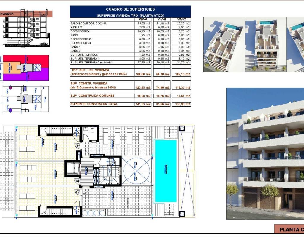 Nybyggda lägenheter i Torrevieja Bara 600 m från Playa del Cura~~Privilegierat läge i hjärtat av Torrevieja~Upptäck dessa helt nya lägenheter och takvåningar i ett av de mest eftertraktade områdena i Torrevieja, bara 600 m från Playa del Cura och 300 m från strandpromenaden. Detta livliga område ligger i stadens centrum och erbjuder alla nödvändiga tjänster inom gångavstånd, inklusive stormarknader, butiker, restauranger, kaféer och kollektivtrafik. Torrevieja är en välkänd kuststad på Costa Blanca, känd för sitt milda medelhavsklimat, sin livliga atmosfär och sin livsstil vid havet året runt.~~Moderna lägenheter med rymlig planlösning~Denna exklusiva nybyggnation består av endast 12 lägenheter och takvåningar med 1 till 3 sovrum, designade för att erbjuda komfort, funktionalitet och modern stil. Lägenheterna på mellanvåningarna har stora terrasser, medan takvåningarna har en extra privat solterrass, perfekt för att sola eller äta utomhus. Alla bostäder har ett öppet kök i anslutning till vardagsrummet, vilket skapar ljusa och mysiga interiörer. Sovrummen har inbyggda garderober och badrummen är fullt utrustade med möbler, speglar och duschväggar. Parkeringsplatser finns tillgängliga mot en extra kostnad.~~Högkvalitativa ytbehandlingar och energieffektiva egenskaper~Lägenheterna är byggda med högkvalitativa material och stort fokus på energieffektivitet. De yttre aluminiumfönstren har termisk brytningsteknik och dubbelglas för värme- och ljudisolering. Motoriserade persienner ger extra komfort och säkerhet. Varje bostad har förinstallation för luftkonditionering och kanaliserad uppvärmning, förstärkta ytterdörrar och vitlackerade innerdörrar. Varmvattnet produceras med ett aerotermiskt system, vilket minskar energiförbrukningen och förbättrar hållbarheten.~~Solarium på taket med gemensam pool~Boende kan njuta av ett exklusivt solarium på taket med gemensam pool, tillgängligt via hiss eller trappor. Detta privata område är perfekt för att koppla av, sola och njuta av den panoramautsikt över staden. Det erbjuder en lugn tillflyktsort ovanför Torreviejas livliga gator och tillför ett betydande mervärde till fastigheten.~~Livsstil och omgivningar i Torrevieja~Torrevieja är känt för sin långa kust, sina sandstränder och sina ikoniska saltfält. Naturparken Lagunas de La Mata y Torrevieja ligger cirka 5 km bort och erbjuder vandringsleder och unika landskap. Flera golfbanor, såsom Villamartin Golf och Las Colinas Golf, ligger mellan 12 och 18 km bort. Torreviejas småbåtshamn och hamn ligger cirka 1 km bort. Alicante flygplats ligger cirka 45 km bort och Murcias internationella flygplats cirka 65 km bort, båda med utmärkta förbindelser inom Europa.~~Ditt hem vid kusten väntar på dig~Missa inte denna möjlighet att köpa en modern, nybyggd lägenhet nära stranden i Torrevieja. Kontakta oss idag för mer information eller för att boka en privat visning.
